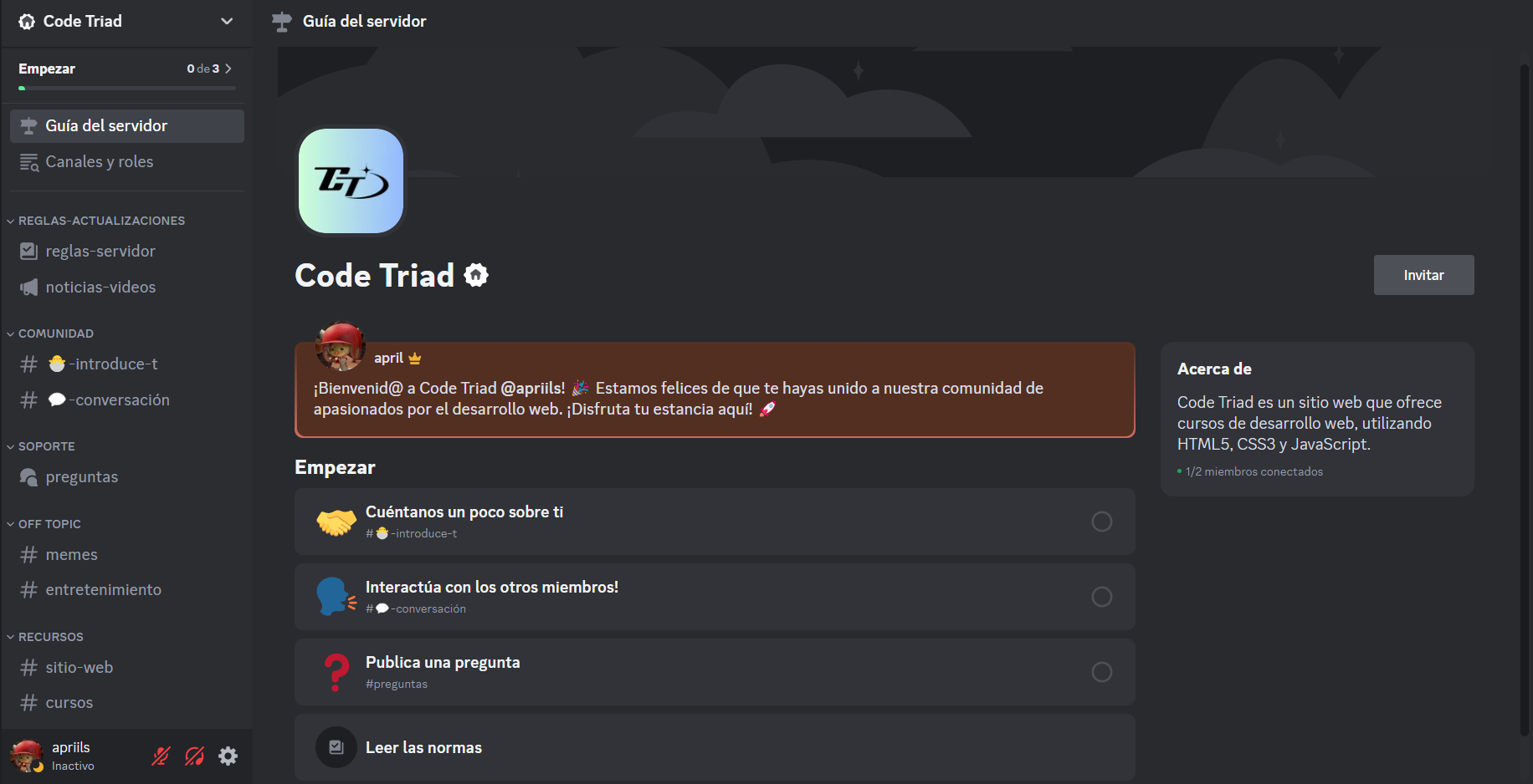 Si deseas unirte al servidor de Code Triad, ponemos a tu disposición el siguiente enlace: https://discord.gg/M2mq9mKgUt